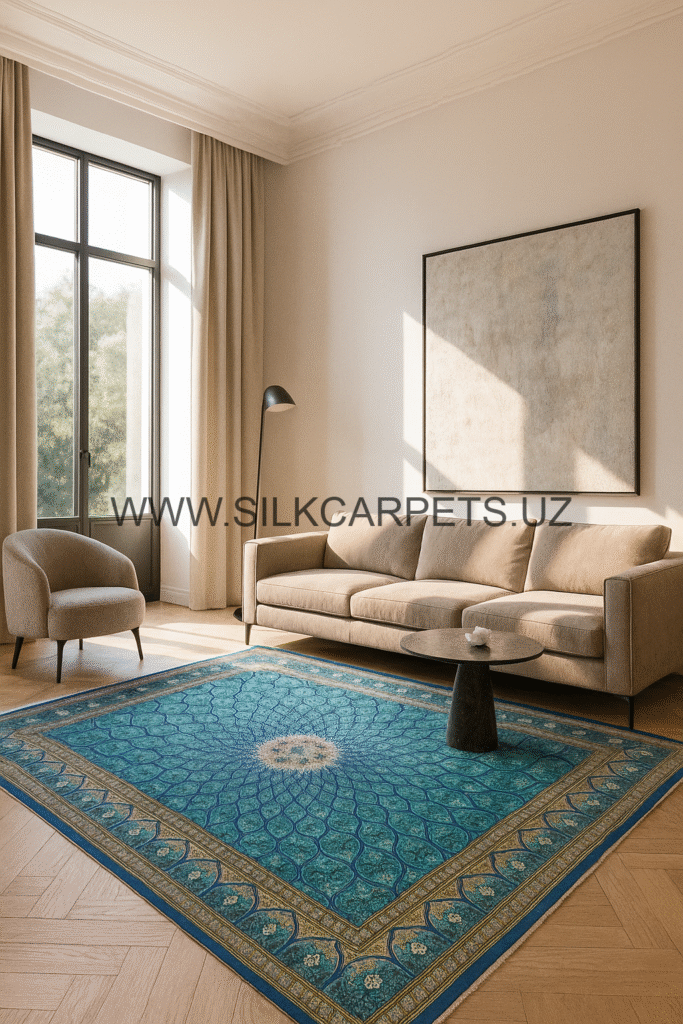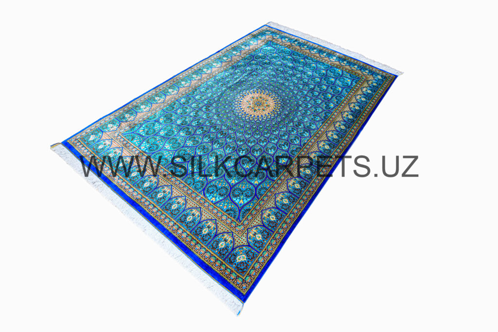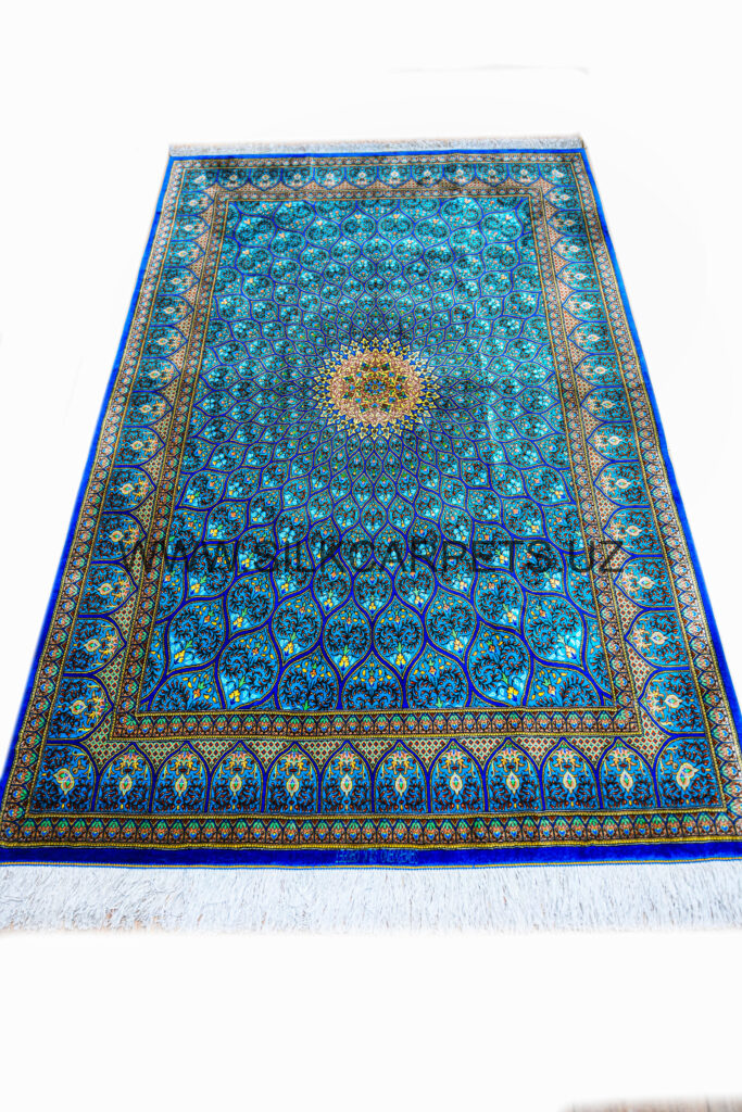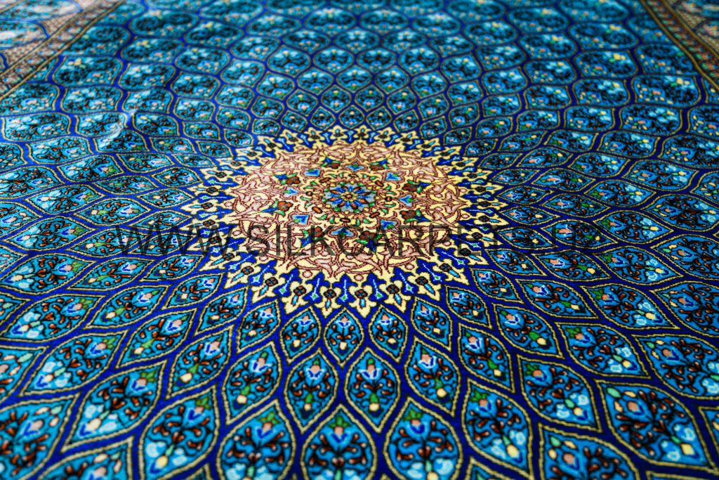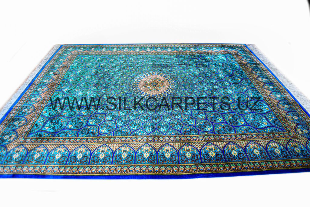 Ceiling of the Tillakari Turquoise Blue Silk Carpet